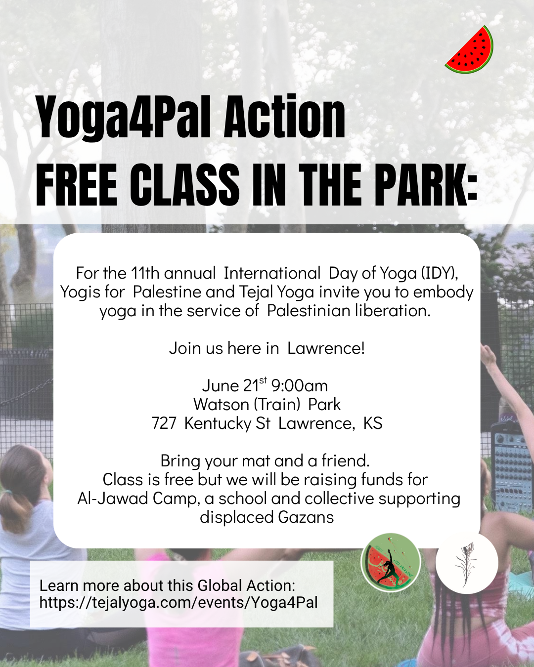 For the 11th annual Internation Day of Yoga we are joining the Global Call to Action from Yogis4Palestine and Tejal Yoga to offer a free community yoga class in Watson Park. In solidarity with the Palestinian movement, we will gather to host a free yoga class themed around action to call for an end to the Zionist entity’s 77-year occupation of Palestine and ongoing genocide and siege against Palestinians in Gaza. While the class is free, we will encourage donations to support on-the-ground mutual aid through fundraising for Al-Jawad Camp, a school and collective supporting displaced Gazans.